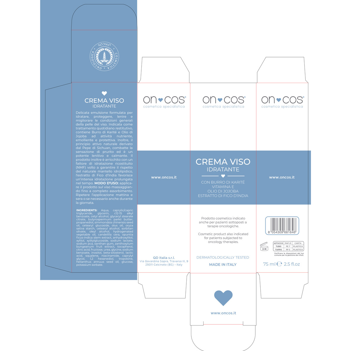Hydratační krém na obličej pro citlivou pleť obsahuje sečuánský pepř, který působí proti pocitu svědění a je silným zklidňujícím a uklidňujícím prostředkem. Pleťový krém pro pacienty s rakovinou je obohacen o hydratační faktor, který zajišťuje respektování přirozeného hydrolipidového pláště pokožky (NMF), a extrakt z opuncie zajišťuje intenzivní a dlouhotrvající hydrataci. Extrakt z opuncie v pleťovém krému pro citlivou pleť je přírodní, získaný použitím na míru šité enzymatické úpravy, která zmenšuje velikost molekul polysacharidu indického fíku, aby se zlepšila účinnost těchto makromolekul zvýšením jejich biologické dostupnosti. Pro výrobu hydratačního pleťového krému byly použity indické fíky pěstované výhradně na Sicílii. Výrobek je tedy 100% Made in Italy.